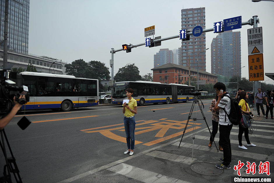 9月12日下午,为了应对晚高峰的出行,科学引导与缓解交通压力,北京市首条潮汐车道正式开通。图为多家媒体关注北京首条潮汐车道开通。中新网记者 金硕 摄