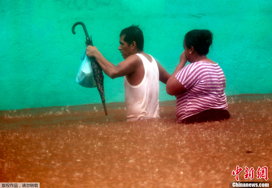 当地时间2013年9月15日,墨西哥格雷罗地区遭受热带风暴“曼努埃尔”侵袭并引发洪水。据美联社报道,洪水已致数十人死亡。图为民众在洪水中行进。