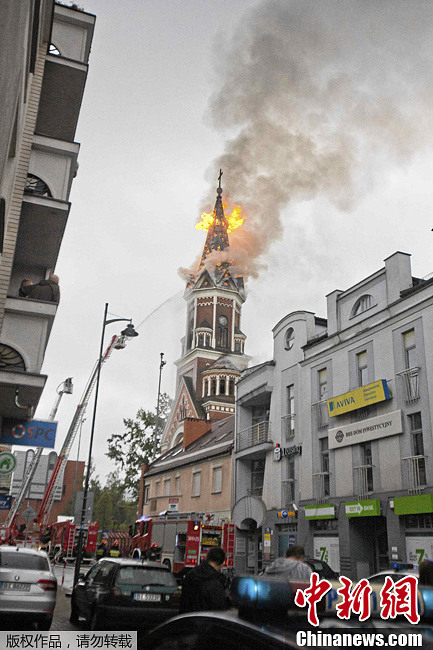 当地时间9月15日,波兰东部比亚韦斯托克市的圣沃伊切赫教堂发生火灾,教堂的尖顶被大火烧塌。