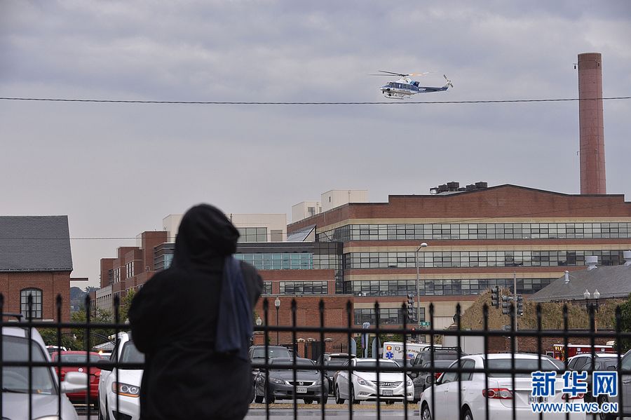 9月16日,在美国首都华盛顿美国海军海洋系统司令部大院附近区域上空,直升机在空中巡逻。当日,位于首都华盛顿的海军海洋系统司令部发生枪击案,造成数人受伤。华盛顿警方负责人凯茜·拉尼尔当日说,当天发生的海军海洋系统司令部枪击案已有1名嫌疑人死亡,可能另有2名嫌疑人在逃。新华社记者张军摄