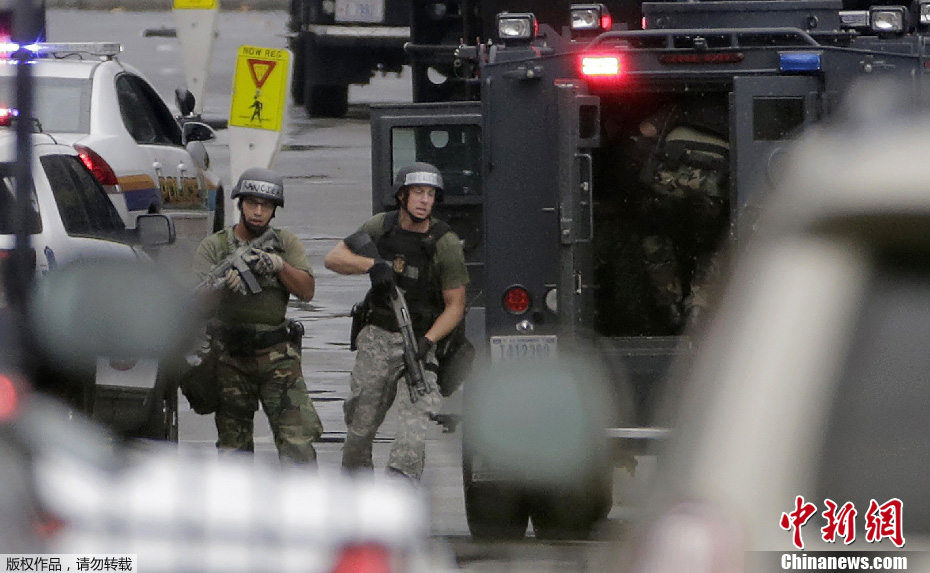 美国首都华盛顿警方16日通报,美国海军海洋系统司令部大楼16日上午8时20分发生枪击案。3名枪手进入大楼1楼对现场人员射击,1名枪手被在场警力击毙,另有2人在逃,动向不明。图为9月16日,美国执法人员介入事件调查。