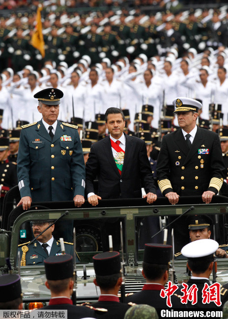 当地时间2013年9月16日,墨西哥首都墨西哥城,墨西哥举行纪念活动庆祝独立203周年。图为墨西哥总统培尼亚·涅托(中)出席阅兵式。