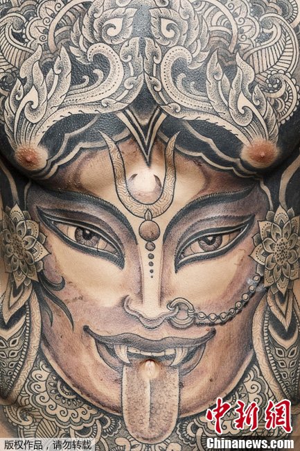 当地时间9月16日,2014马德里时装周举行,男模走秀夸张纹身吸引眼球。