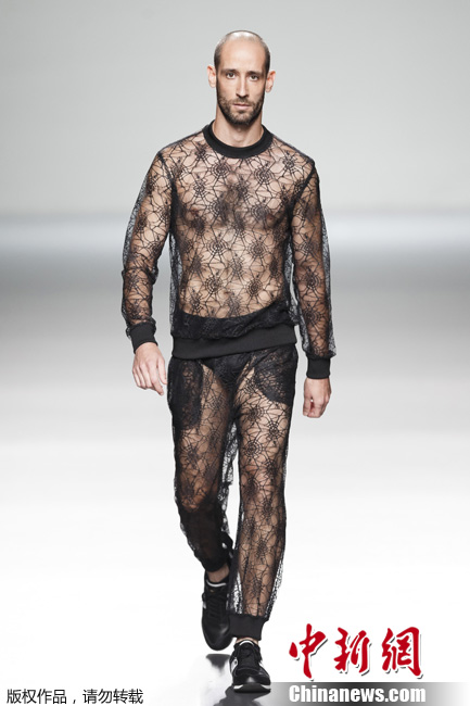 9月16日,马德里时装周举行,男模蕾丝透视装吸引眼球。