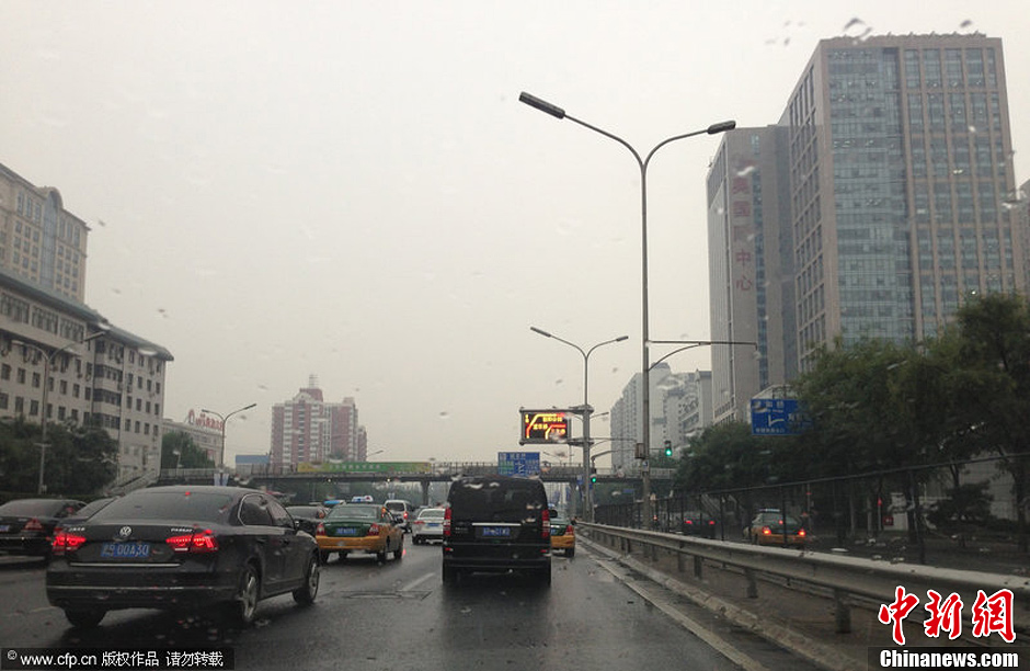 2013年9月17日,北京,中秋节前尾号4、9限行的工作日,路上车多再加之降雨,曾被预测为最堵周中的最堵日,交通指数峰值将达到9以上。图片来源:CFP视觉中国