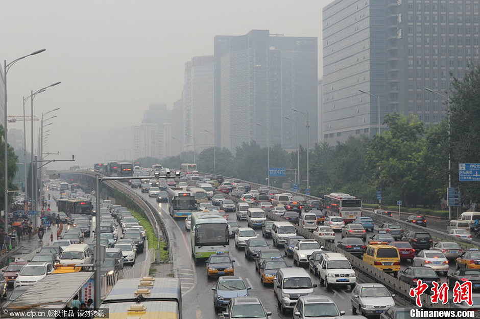 2013年9月17日,北京,中秋节前尾号4、9限行的工作日,路上车多再加之降雨,曾被预测为最堵周中的最堵日,交通指数峰值将达到9以上。图片来源:CFP视觉中国