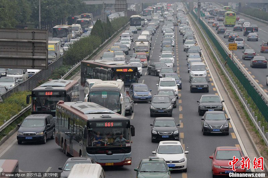 2013年9月17日,北京,中秋节前尾号4、9限行的工作日,路上车多再加之降雨,曾被预测为最堵周中的最堵日,交通指数峰值将达到9以上。刘畅 摄 图片来源:CFP视觉中国