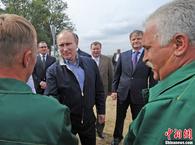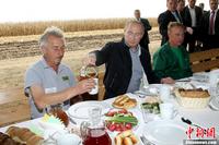9月17日,俄罗斯总统普京在2013年收成进程问题的会议前参观了库班乌斯季-拉宾斯克区的一块田地,他观看了玉米收集工作并同康拜因手(联合收割机使用者)共进午餐。图片来源:CFP视觉中国