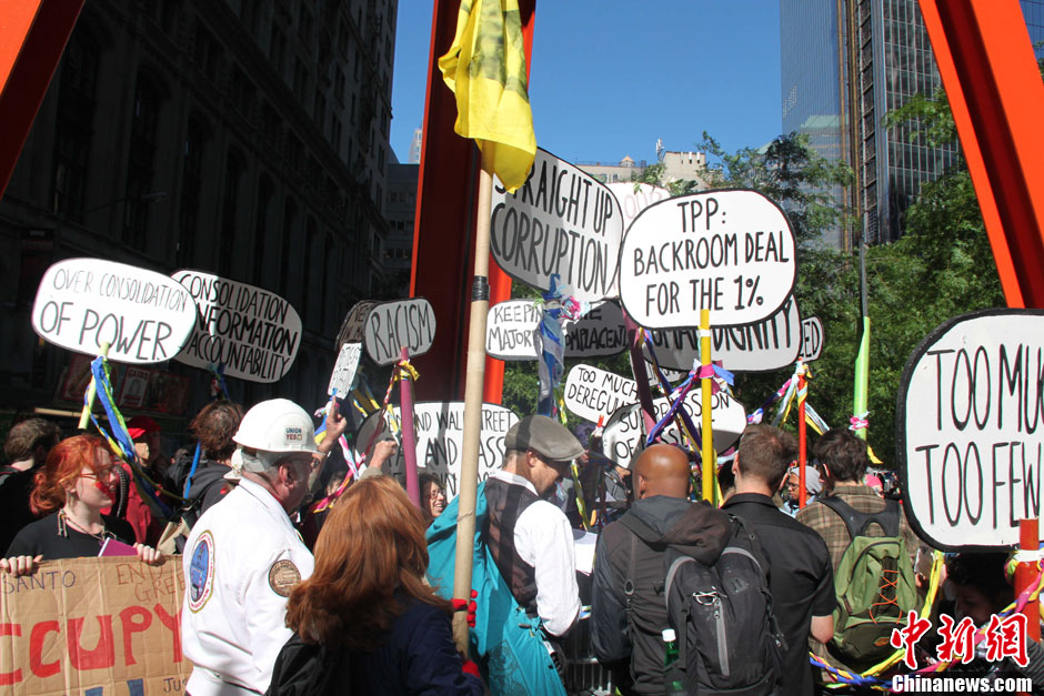 当地时间9月17日,“占领华尔街”示威两周年,大批示威者重聚纽约曼哈顿下城祖克提公园聚集。中新社发 李洋 摄