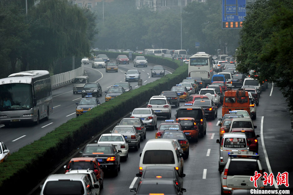 9月18日上午,早高峰北京环路多条路网行驶缓慢,东二环、东三环持续车多。图为东二环早高峰车辆行驶缓慢。中新网记者 金硕 摄