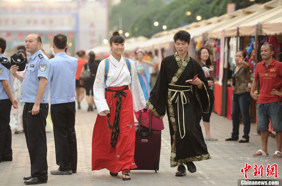 9月17日晚,重庆一对情侣穿着汉服行走在洋人街。中新社发 陈超 摄