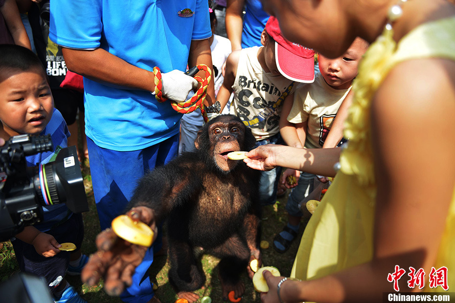 9月15日上午,15家热爱动物的家庭来到无锡动物园内,利用各种水果、蔬菜、窝头等食物,为大象、黑猩猩、长颈鹿、节尾狐猴、猕猴、熊等动物制作中秋月饼,现场主要为5-8岁的小朋友,大家充分发挥自己的想象力,在爸爸妈妈的指导下DIY了动物月饼,提前给小动物们过了一个有意义的中秋节。图为小朋友正在喂食黑猩猩河童“水果月饼”。中新社发 李一芳 摄