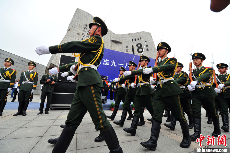 9月18日,勿忘“九·一八”主题撞钟鸣警仪式在沈阳柳条湖畔“九·一八”历史博物馆残历碑广场举行,中国人民解放军、武警官兵、民众等参加纪念活动。中新社发 于海洋 摄