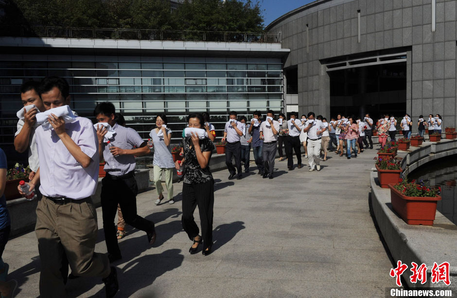 9月18日,纪念“九·一八”事变82周年,安徽合肥城区统一试鸣防空警报音响信号,并在包河区政府内进行消防灭火、楼顶救人、120急救等组织实施和消除空袭后果救援等大型现场演练。中新社发 张娅子 摄