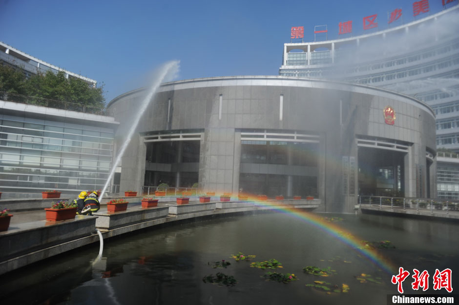 9月18日,纪念“九·一八”事变82周年,安徽合肥城区统一试鸣防空警报音响信号,并在包河区政府内进行消防灭火、楼顶救人、120急救等组织实施和消除空袭后果救援等大型现场演练。中新社发 张娅子 摄