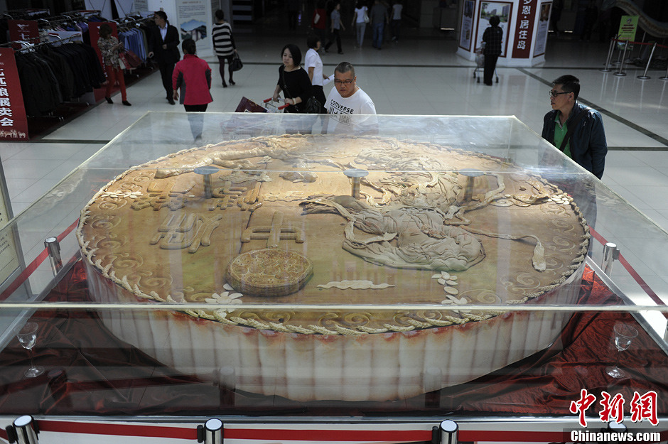 9月17日,一款带有“嫦娥奔月”图案,重达1200斤的巨型月饼亮相长春一家商场内,吸引大量市民参观。据了解,这款巨型月饼是纯手工制作而成的,直径达3米,总厚度15厘米。月饼为果仁豆沙馅,馅料总重840斤,另外还使用了360斤的面粉、糖和油。张瑶 摄