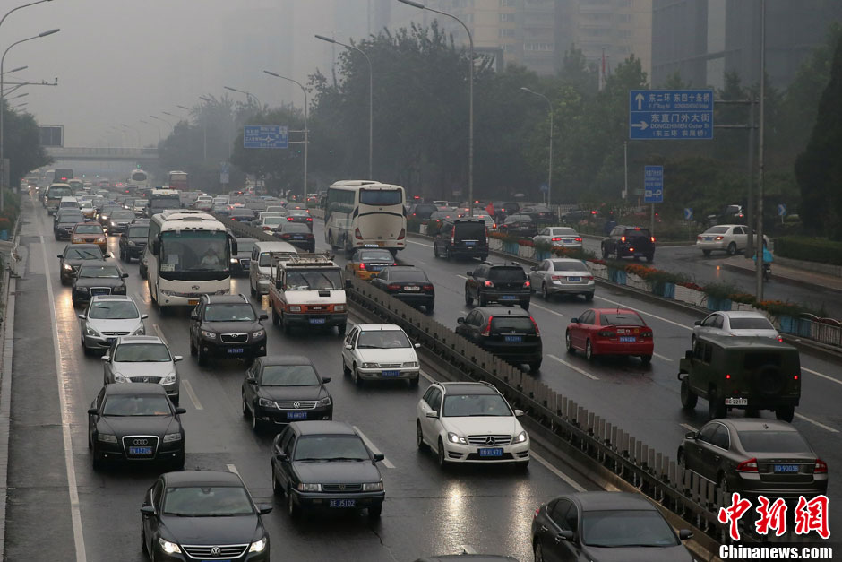 9月18日,北京中秋节前最后一天工作日早高峰遭遇大雾天气,汽车司机纷纷打开雾灯。中新社发 韩海丹 摄