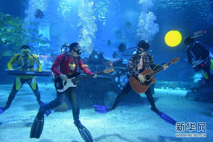 9月17日,乐手在天津海昌极地海洋世界“海底音乐会”上表演。为迎接即将来临的中秋节游客高峰,天津海昌极地海洋世界组建一支“海洋乐队”,乐手们将在极地海洋世界内的海底隧道伴随着“海底圆月”表演,配以提前录制好的外放音乐,为游客献上独特的“海底音乐会”。新华社发 周伟 摄 图片来源:新华网