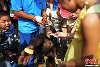 一年一度的中秋佳节到来之际,江苏扬州市茱萸湾动物园的工作人员和饲养员一起为大熊猫,金丝猴,猩猩等动物园的动物们精心准备了一特制的美味“月饼”让动物们品尝,尽享中秋佳节的喜庆气氛。图为“瑛美”正在品尝特制美味“月饼”。孟德龙 摄