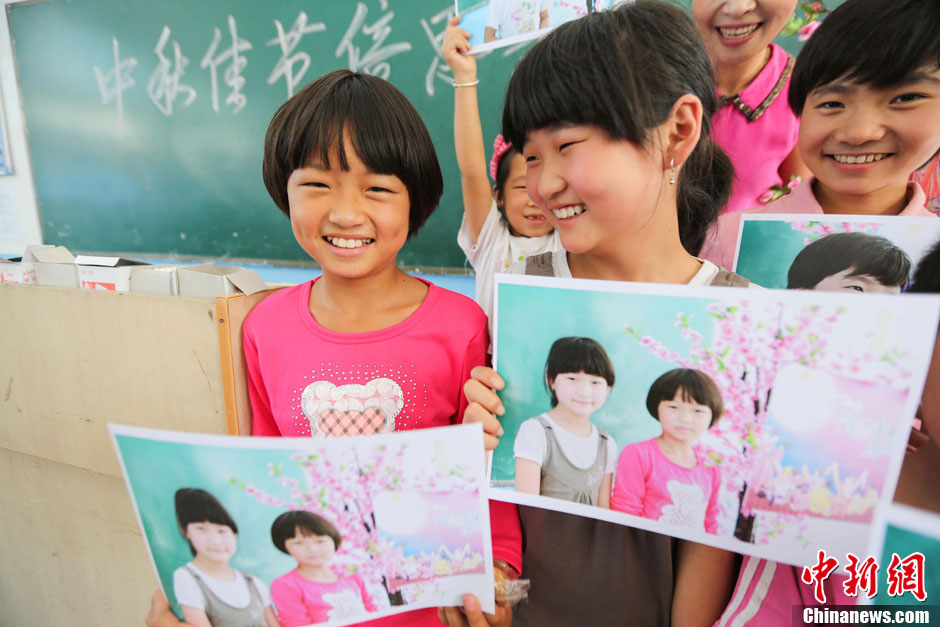 9月18日,中秋佳节将至,国网淮北供电公司的青年志愿者来到安徽省淮北市刘桥镇任圩小学,提前给这里20多名留守儿童过中秋。志愿者们还为留守儿童拍摄纪念照,打印后寄给他们的父母。中新社发 韩苏原 摄