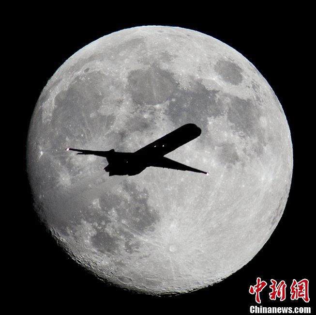 当地时间9月17日晚,美国加利福尼亚州洛杉矶,一架准备降落洛杉矶国际机场的飞机从一轮明月前飞过。中新社发 林戈 摄