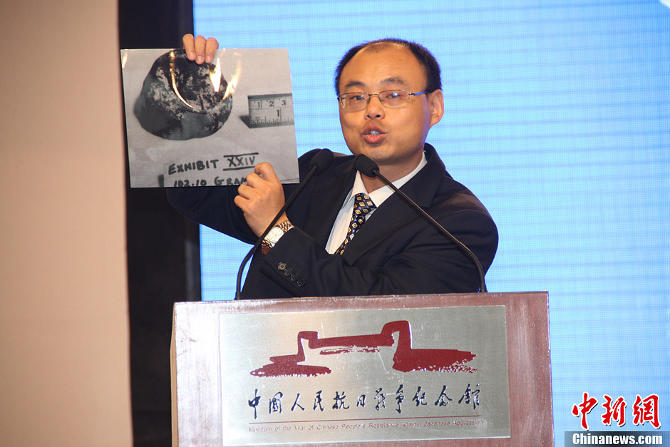 9月18日,“九一八”事变爆发82周年之际,日本强掳中国赴日劳工罪行档案在北京公布,这是幸免烧毁的120袋珍贵档案首次在中国公布。图为当年劳工张金亭的孙子张恩龙以照片的形式,向人们展示劳工们所住的木板楼、所吃的橡子面窝窝头以及劳工们枯瘦如柴的合影等。中新社发 杜燕 摄