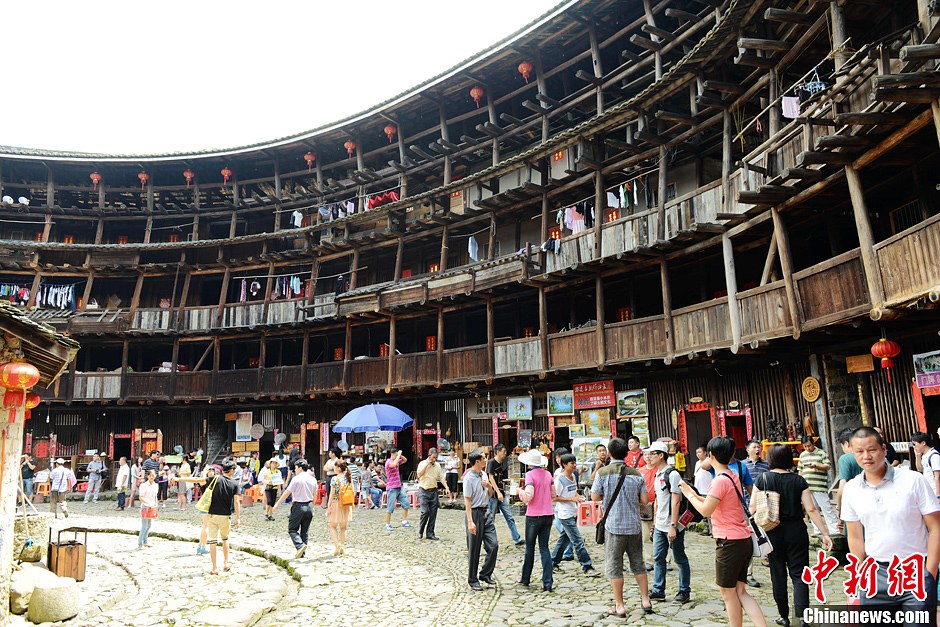 近日,随着国庆中秋双节临近,世界物质文化遗产福建土楼迎来大批游客,提早出行、错峰出游成为许多游客的选择。中新社发 王东明 摄