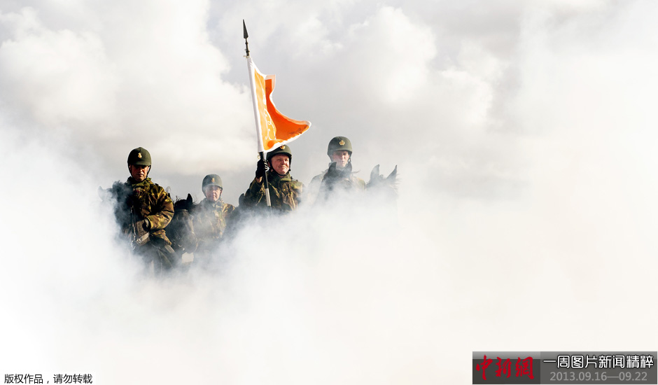 当地时间2013年9月16日,荷兰斯海弗宁恩海滩,骑士们在烟幕中骑着骏马进行应对突发事件的演习活动。