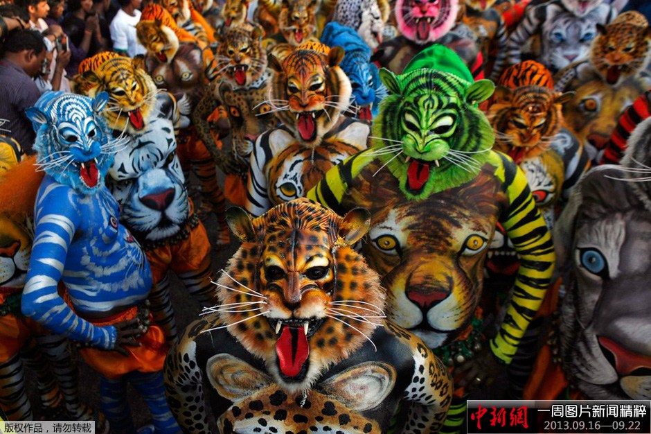当地时间2013年9月19日,印度德里久尔,演员头戴面具,身着彩绘准备跳“老虎舞”。
