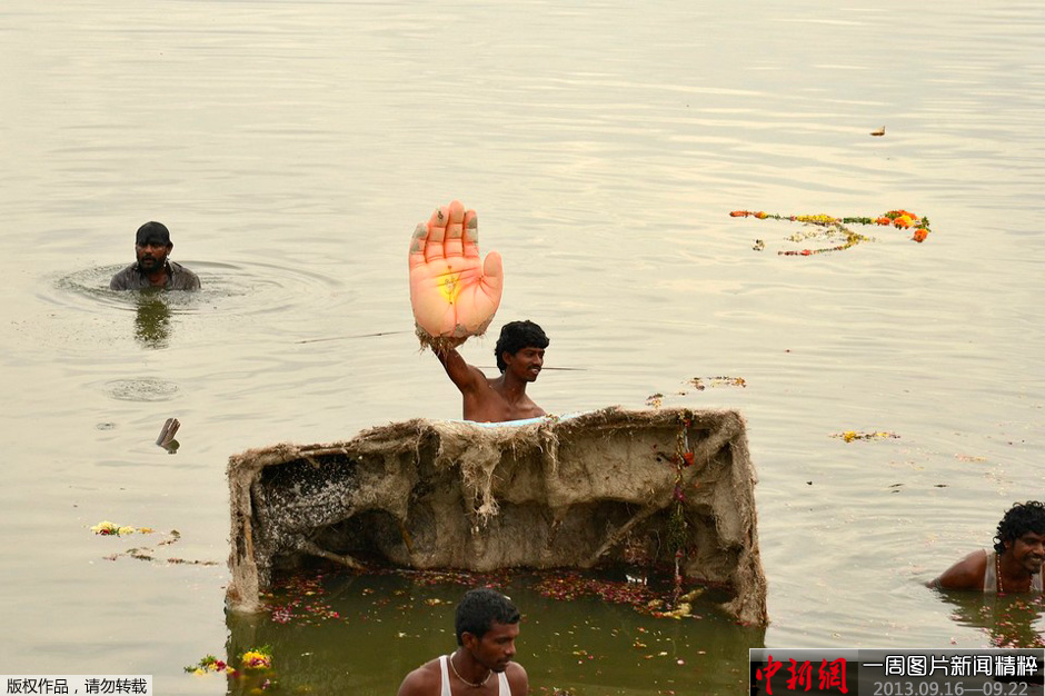 9月17日,印度海德拉巴(Hyderabad)庆祝甘尼许节(Ganesh Chaturthi)。图为在候赛因纳加尔湖(Hussain Sagar Lake)举行的仪式上,一名男子举起象头神甘尼许(Ganesha)圣像的一只手。该神在印度教中象征着繁荣兴旺。
