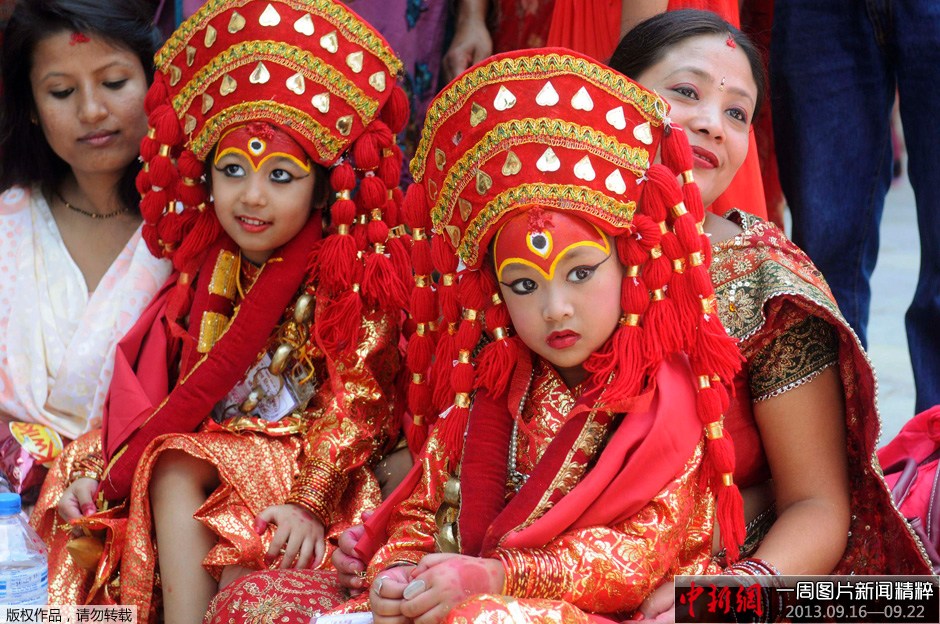 9月17日,尼泊尔加德满都,身着传统服饰的女孩们正等待参加专为女孩举行的拜祭仪式,祈求在未来免遭灾祸并获得好运。