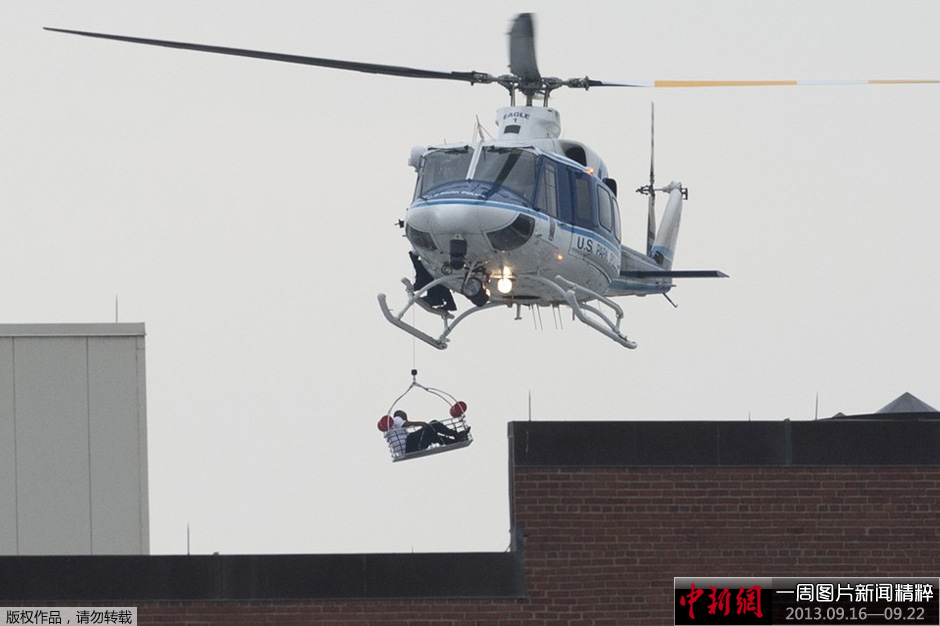 9月16日,华盛顿,一架直升机从屋顶上吊起一个人,此时警方正对美国海军基地(U.S. Navy Yard)发生的枪击案做出反应。警方称此次枪击事件造成至少12人死亡,其中包括一名持枪嫌疑人,另有多人受伤。