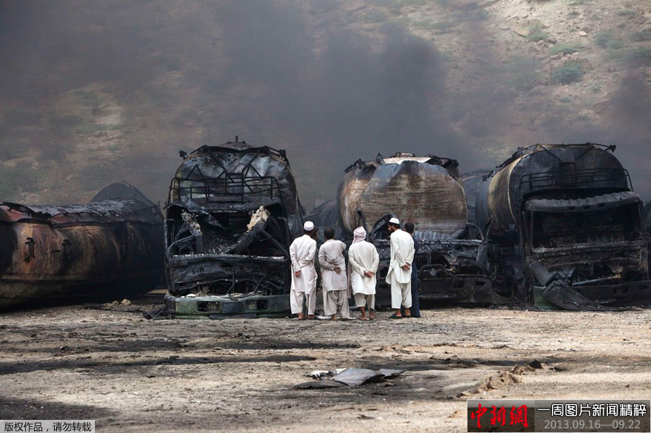 9月16日,巴基斯坦,几名男子站在被烧毁的北约(NATO)补给车队油罐车附近。之前一天,距卡拉奇约25公里的Hub镇发生了一起袭击事件。这些为北约驻阿富汗部队运送燃料的油罐车周日在巴基斯坦境内被激进分子纵火点燃。