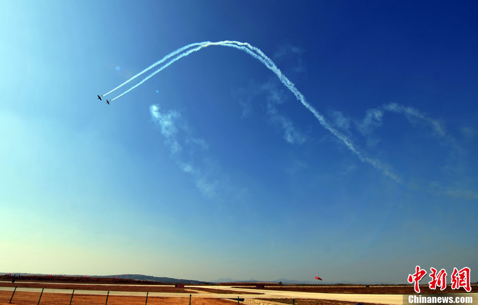 9月22日,飞机进行特技飞行表演。当日,沈阳法库第二届国际飞行大会闭幕式在沈阳法库财湖机场举行,现场10余万观众观看闭幕式飞行表演。中新社发 于海洋 摄