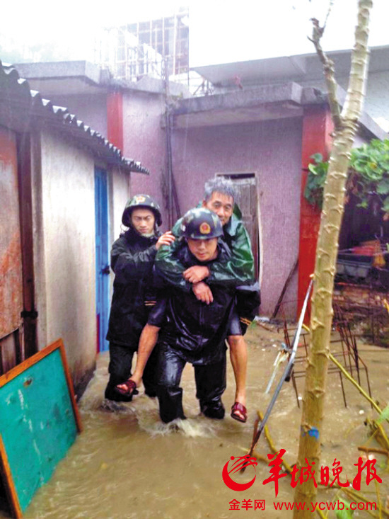 汕头妈屿岛,边防官兵蹚水转移出50名被困群众。9月22日19点40分,强台风“天兔”在广东汕尾沿海地区登陆。受“天兔”与天文大潮叠加影响,汕头市多处出现海水倒灌,致使城区内涝。林春伟 蔡敏 王漫琪 摄 图片来源:金羊网