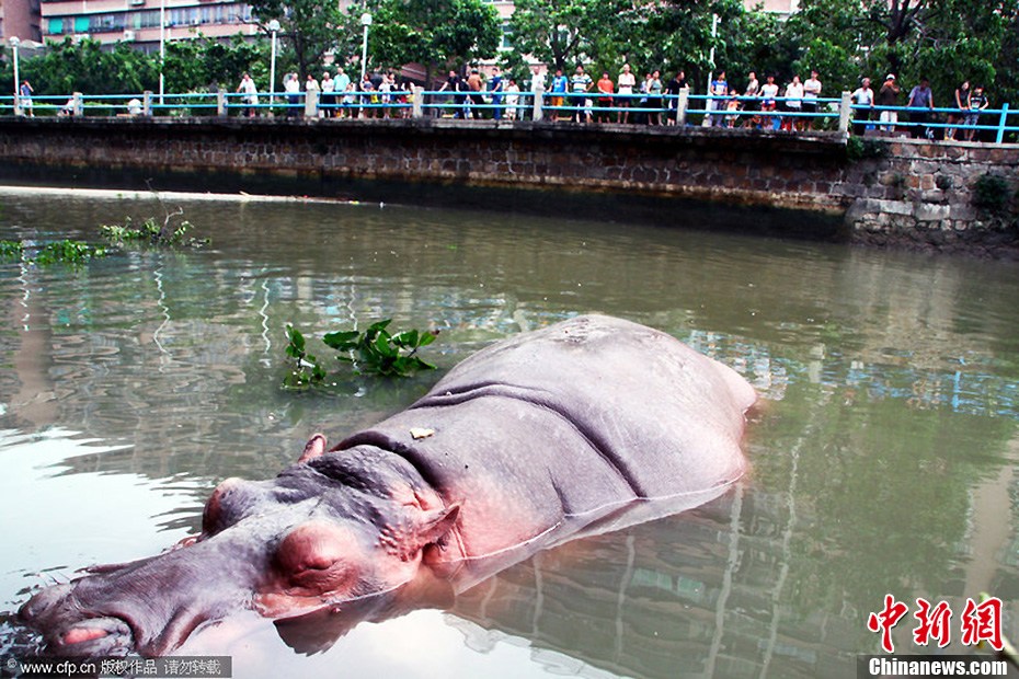 2013年09月23日,广东省汕头市,受今年第19号强台风“天兔”及天文大潮期影响,汕头出现海水倒灌,中心城区多地严重浸水。位于老市区中山公园内的汕头市动物园,积水最深时超过一米,一只2吨多的河马顺着水流“越狱”翻出围栏,游至公园外围的河流内。据了解,这只河马自2008年起在该动物园“安家”。图为出逃的河马躺在公园外围的河流,引来市民围观。图片来源:CFP视觉中国