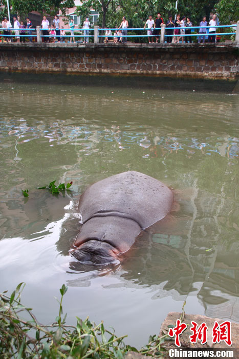 9月23日,受强台风“天兔”及天文大潮期影响,汕头市出现海水倒灌,中心城区多地严重浸水。位于老市区中山公园内的动物园,积水最深时超过一米,一只2吨多的河马顺着水流“越狱”翻出围栏,游至公园外围的河流内。中新社发 黄鸿华 摄