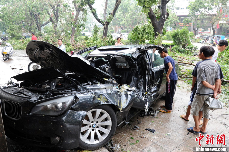 9月23日,一辆香港车牌的宝马小车横放在汕尾市的一处行人道上,该车22日晚在风灾中严重受损。9月22日19时40分前后,强台风“天兔”的中心在广东省汕尾市沿海登陆,令该市遭受严重破坏。中新社发 梁永强 摄