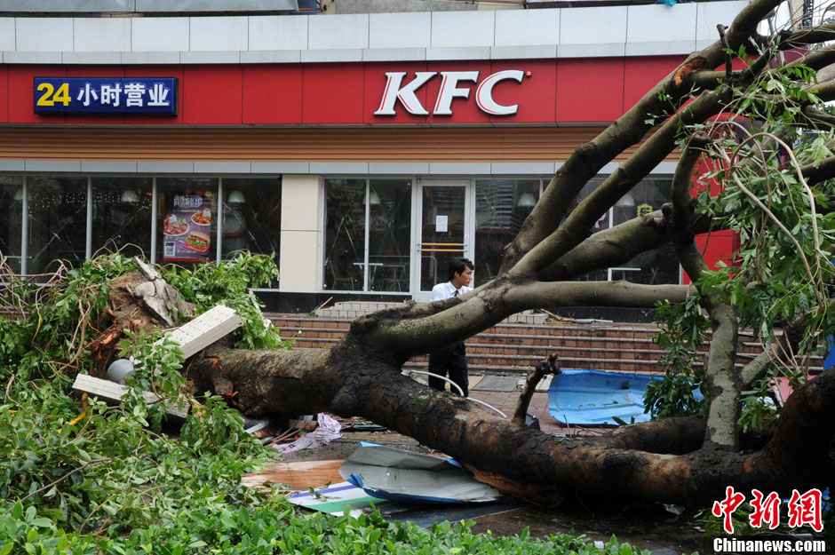 9月22日19时40分前后,强台风“天兔”的中心在广东省汕尾市沿海登陆,令该市遭受严重破坏。全市范围内交通、通讯、供电和供水中断,其中停电面积超65%。至23日中午,仍有不少商铺停业。中新社发 梁永强 摄
