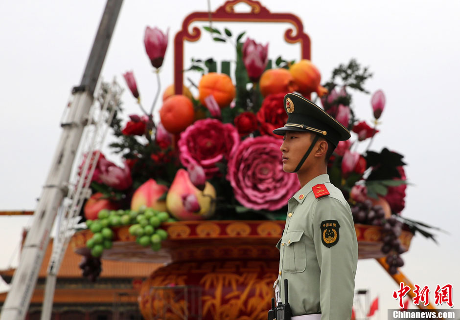 9月23日,天安门的武警走过“花果篮”。当日,北京天安门广场“祝福祖国”花坛主景“花果篮”完成主体结构安装。据了解,2013年国庆花篮高达18.2米,篮盘直径达到15米,中心花坛直径达到50米,是天安门广场历年最大的花篮。中新社发 韩海丹 摄