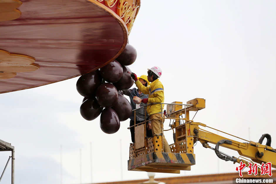 9月23日,工作人员在为“葡萄”做最后的补色。当日,北京天安门广场“祝福祖国”花坛主景“花果篮”完成主体结构安装。据了解,2013年国庆花篮高达18.2米,篮盘直径达到15米,中心花坛直径达到50米,是天安门广场历年最大的花篮。中新社发 韩海丹 摄