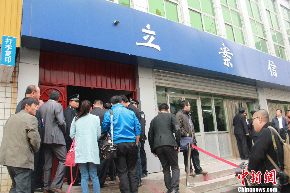 陕西省榆林市靖边县人民法院于9月24日上午8时30分,在该院二楼审判庭公开审理被告人龚爱爱伪造、买卖国家机关证件一案。大批民众与媒体记者已聚集于法院门外。图为聚集在法院门外的媒体与民众。张一辰 摄