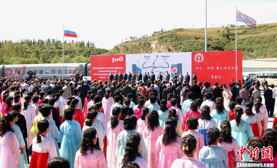 当地时间2013年9月22日,俄罗斯与朝鲜重开了一段长约54公里的铁路。该铁路段从俄罗斯东部边境城市哈桑(Khasan)通往朝鲜罗津(Rajin),全长54公里,将用来输出煤炭,并输入来自韩国和其他亚洲国家的商品。图为朝鲜民众在庆祝仪式上。
