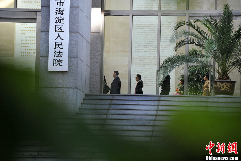 9月26日上午,北京海淀法院将对李某某等五人强奸一案进行公开宣判。当日,海淀法院门口聚集大批媒体采访拍摄。图为梦鸽现身海淀法院。中新网记者 金硕 摄