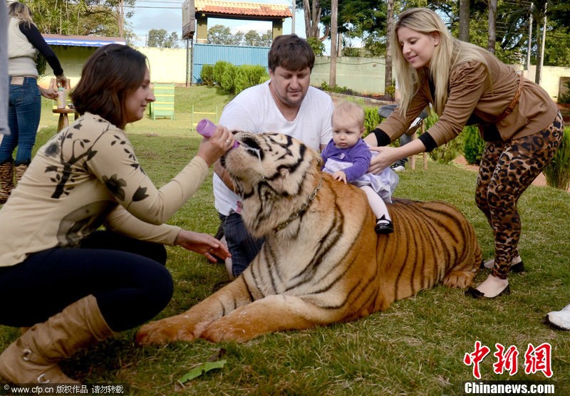 2013年9月25日消息(具体拍摄时间不详),巴西马林加,巴西一个家庭已经不满足于饲养猫狗作为宠物,而是饲养了七只老虎。Aryas Borges最初与老虎结缘是因为拯救了两只在马戏团处境恶劣的老虎。老虎就像他的家庭成员一样,和他的三个女儿一起吃饭、洗澡、玩耍,从小一起长大。如今这些“大猫”在他的家里生活的非常快乐,和他的家庭积累了非常深厚的感情。这种猛兽在他们面前展现出难得温柔的一面。图片来源:CFP视觉中国