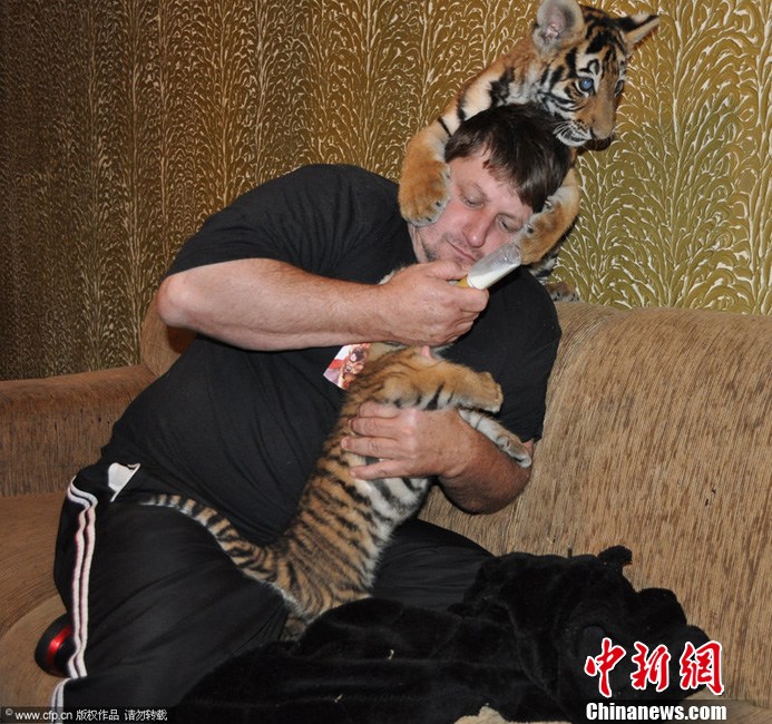 2013年9月25日消息(具体拍摄时间不详),巴西马林加,巴西一个家庭已经不满足于饲养猫狗作为宠物,而是饲养了七只老虎。Aryas Borges最初与老虎结缘是因为拯救了两只在马戏团处境恶劣的老虎。老虎就像他的家庭成员一样,和他的三个女儿一起吃饭、洗澡、玩耍,从小一起长大。如今这些“大猫”在他的家里生活的非常快乐,和他的家庭积累了非常深厚的感情。这种猛兽在他们面前展现出难得温柔的一面。图片来源:CFP视觉中国