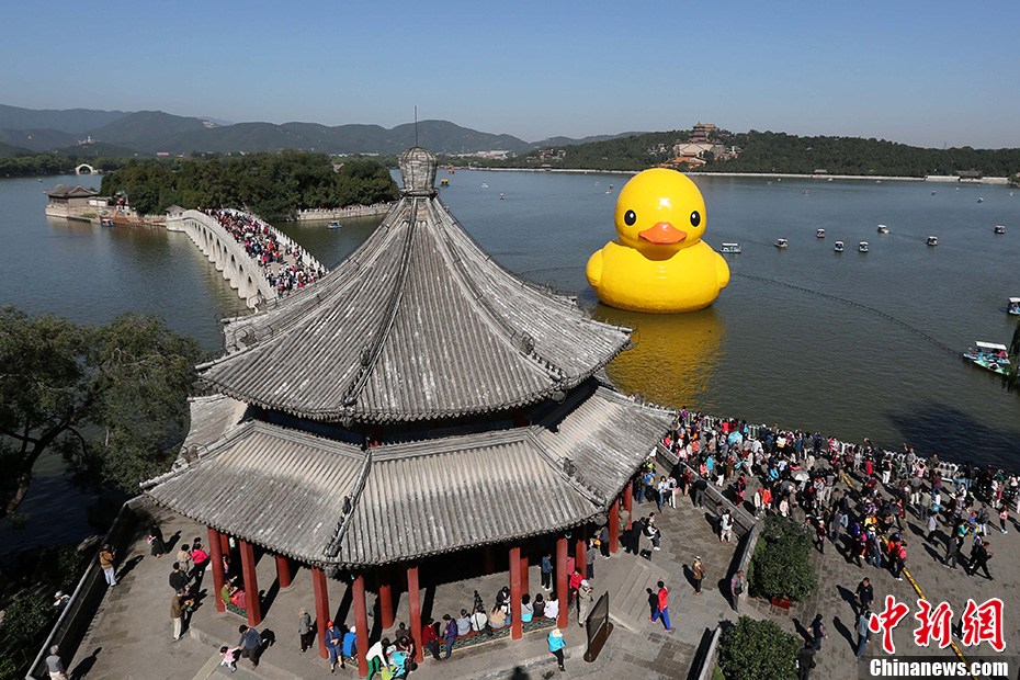 9月26日,颐和园大黄鸭首秀,吸引不少游客围观。中新社发 韩海丹 摄