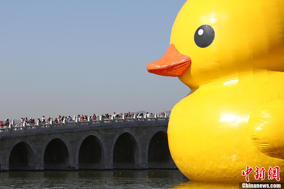 9月26日,颐和园大黄鸭首秀,吸引不少游客围观。中新社发 韩海丹 摄