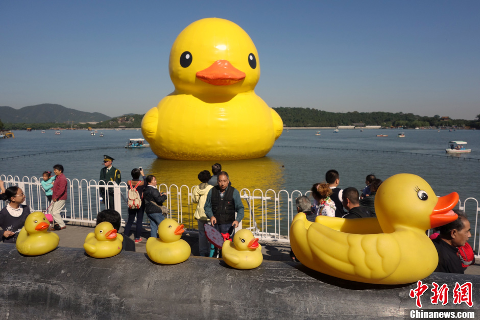 9月26日,北京市民耿先生从家中取来给孙子洗澡用的“小黄鸭”,摆放在颐和园廓如亭边,与“大黄鸭”合影留念。从当日开始,“大黄鸭”正式亮相北京颐和园,一直持续到10月26日。中新社发 张炜 摄