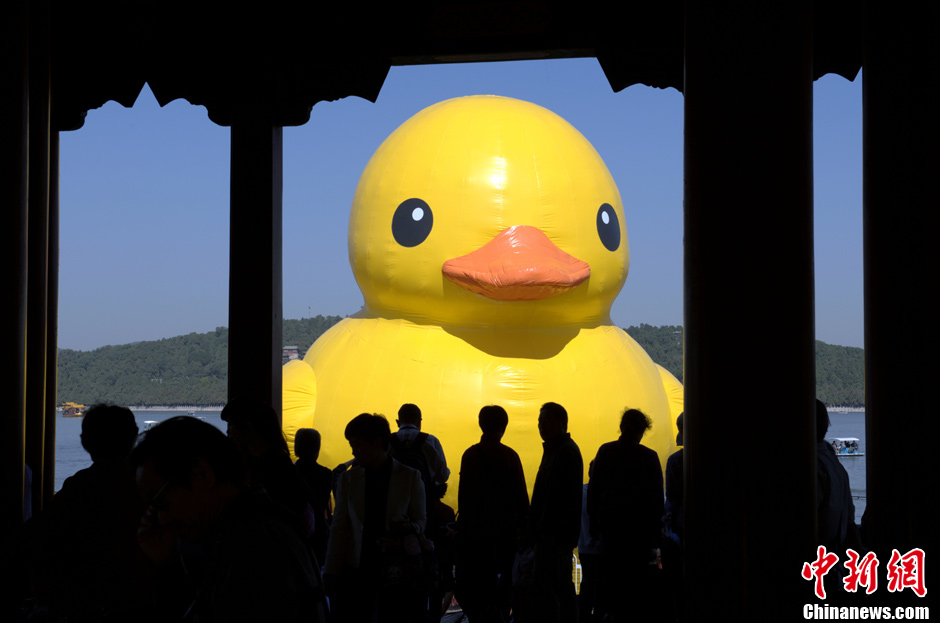 9月26日上午,来自海内外的大批游客在颐和园廓如亭上观赏正版“大黄鸭”。从当日开始,“大黄鸭”正式亮相北京颐和园,一直持续到10月26日。中新社发 张炜 摄